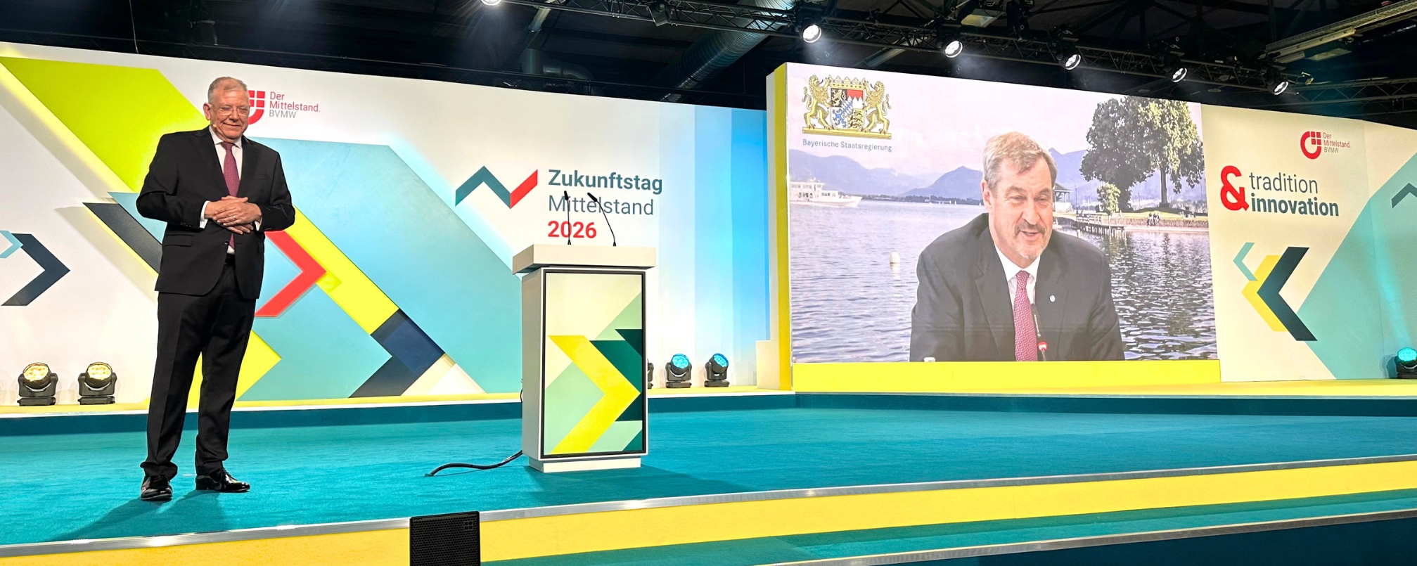 Mit scharfer Kritik an der Wirtschaftspolitik der Großen Koalition hat Mittelstandschef Christoph Ahlhaus in Berlin den Zukunftstag Mittelstand 2026 des Bundesverbandes mittelständische Wirtschaft (BVMW) eröffnet. Auf der weltgrößten Mittelstandsmesse forderte der Vorsitzende der BVMW-Bundesgeschäftsführung die Bundesregierung auf, den Sachverstand des Mittelstands endlich stärker bei politischen Entscheidungen einzubinden. Aus München zugeschaltet, unterstrich Bayerns Ministerpräsident Dr. Markus Söder die Bedeutung des unternehmerischen Mittelstands als verlässlicher Partner. Der CSU-Vorsitzende betonte zugleich, dass ein Scheitern der derzeitigen Bundesregierung keine Option sei. Bundesarbeitsministerin Bärbel Bas (SPD) warb bei Mittelständlern für einen engeren Schulterschluss zwischen Politik und Wirtschaft.